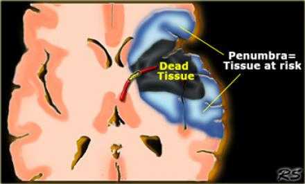 Пенумбра: Окклюзия в СМА. Черным указано ткань с необратимыми изменениями или мертвая ткань. Красным выделена ткань-риска или пенумбра.