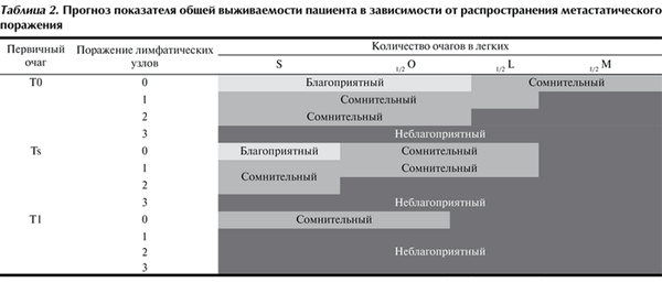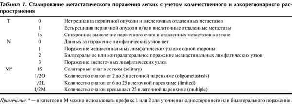 По нашему мнению, стоит разработать и использовать классификацию легочных метастазов, в которой будет учитываться не только количество очагов в легких, но и поражение лимфатических узлов (табл. 1). Таблица 1. Стадирование метастатического поражения легких с учетом количественного и локорегионарного распространения Примечание. * — в категории М можно использовать префикс 1 или 2 для уточнения одностороннего или билатерального поражения.