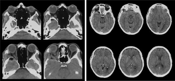 В раннем послеоперационном периоде выполнена КТ головного мозга и орбит, по результатам которой остаточной опухолевой ткани не определяется (рис. 5).