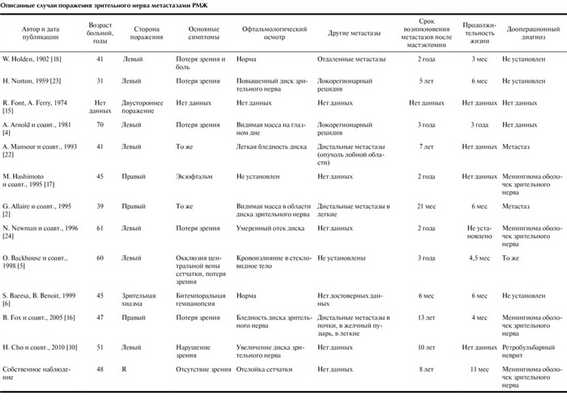 При анализе литературы нами было найдено 12 случаев метастатического поражения зрительного нерва.