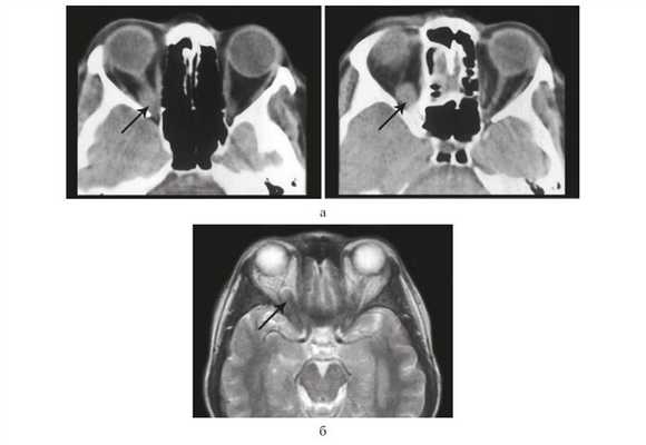 Рисунок 1. КТ (а), МРТ (б) орбит. В задних отделах правой глазницы определяется овальной формы опухоль (стрелка), плотно охватывающая зрительный нерв и распространяющаяся в канал зрительного нерва.