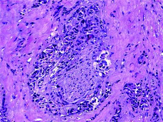 Рисунок 3. Метастаз РМЖ в зрительном нерве. Окраска гематоксилином и эозином. ×200.
