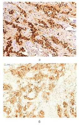 Рисунок 4. Метастаз РМЖ в зрительном нерве. а — иммуногистохимическая реакция с рецепторами эстрогенов. ×200; б — иммуногистохимическая реакция с рецептором гена Her-2-neu (Cerb-B2). ×400.
