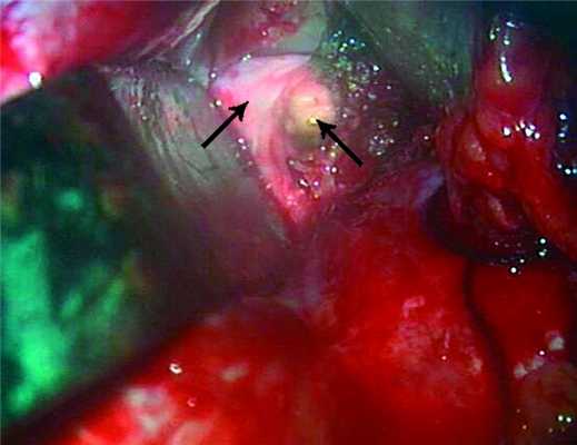 Рисунок 2. Интраоперационный снимок. Определяется ксантохромной окраски метастаз и растянутый над ним зрительный нерв (стрелки). При попытке отделения опухоли от зрительного нерва выявлено, что она прорастает его оболочку. Произведено пересечение зрительного нерва в месте выхода его из переднего полюса опухоли, затем по мере коагуляции и иссечения инфильтрированных тканей глазницы связанный с нервом узел опухоли выделен до входа в зрительный канал. В проекции передней трети зрительного канала инфильтрированная часть зрительного нерва переходила в нормальную. Произведена коагуляция и пересечение внутриканальной части зрительного нерва на этом уровне, и опухоль удалена вместе с пораженным зрительным нервом. Затем иссечены инфильтрированные участки верхней и латеральной прямых мышц. При осмотре зрительного канала дальнейшего интракраниального распространения опухоли не выявлено. При срочной биопсии - «злокачественная опухоль». Выполнена пластика основания черепа с применением фрагментов жировой клетчатки глазницы и лоскутом надкостницы на ножке из лобно-теменной области. После установки и фиксации костного лоскута наложены послойные швы на мягкие ткани раны.