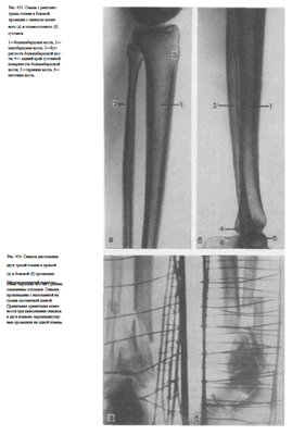 На снимке проксимальных двух третей голени (на пленке размером 24 х 30 см) раздельно определяются диафизы берцовых костей, а проксимальные метаэпифизы наслаиваются друг на друга. Видна бугристость большеберцовой кости (рис, 433, а).