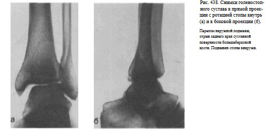 Информативность снимков. На снимках голеностопного сустава в прямой задней проекции выявляются дистальные отделы берцовых костей, медиальная и латеральная лодыжки, блок таранной кости и рентгеновская щель голеностопного сустава латерального отдела голеностопного сустава. Рентгеновская суставная щель на снимке голеностопного сустава с ротацией стопы выглядит в виде буквы «П», при этом ширина ее на всем протяжении одинаковая. Расширение латерального или медиального отдела суставной щели при наличии перелома лодыжек свидетельствует о подвывихе в суставе (рис. 438).