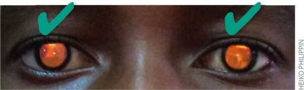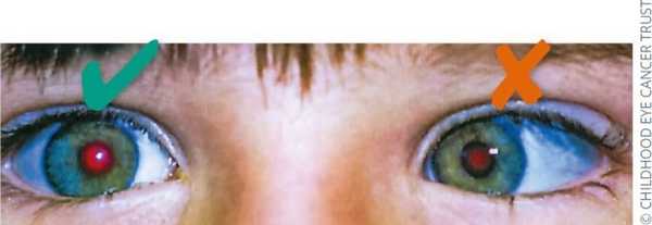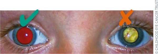 - лейкокория (вы можете увидеть на рис. 1 этот симптом, называемый также «кошачий глаз»), то есть свечение зрачка бело-желтым цветом, когда от поверхности опухоли отражается свет, это нередко заметно на фотографиях;