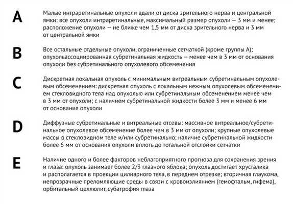 В Амстердаме в 2001-м году предложили международную классификацию интраокулярной (внутриглазной) ретинобластомы. Главная цель этой классификации - определить четкие показания к тому, чтобы проводить органосохраняющую терапию. Если поражение двухстороннее, то классификация применяется отдельно к каждому глазу.