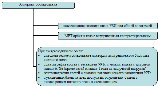 Интраокулярная биопсия может привести к диссеминации злокачественных клеток внутри глаза, поэтому к ее проведению прибегают только при наличии абсолютных показаний. Для оценки распространенности ретинобластомы используются рентгенография орбиты, рентгенография околоносовых пазух, КТ и МРТ головного мозга, сцинтиграфия печени, остеосцинтиграфия. Для оценки возможного отдаленного метастазирования прибегают к выполнению люмбальной пункции с исследованием цереброспинальной жидкости; пункции костного мозга и исследованию миелограммы.