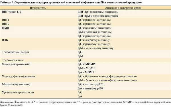 Ни в одном случае не выявлены маркеры активности ВЭБ, токсоплазмы и других инфекций при воспалительных гранулемах. При РБ диагностировали значительную инфицированность онкогенным вирусом ВЭБ.