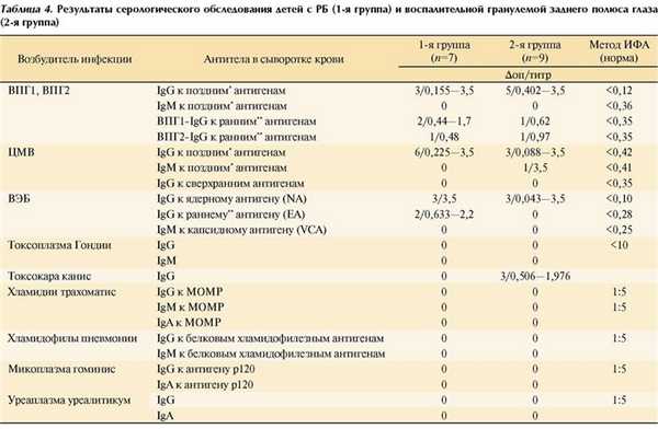 Иммунологические исследования по дифференциальной диагностике РБ и ретинита Коатса показали высокий уровень эритропоэтина (до 90% при стадии Т3) в сыворотке крови у больных с опухолью и отсутствие цитокина при ретините Коатса и у здоровых детей [6], что позволило провести дифференциальную диагностику опухолевого и псевдотуморозного процесса. Однако до настоящего времени сравнительный анализ инфекционного статуса у детей с РБ и воспалительной гранулемой заднего полюса глаза не проводили.