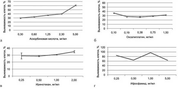 IC50 для оксалиплатина, иринотекана и ифосфамида не получена. Для оксалиплатина при минимальной используемой концентрации 0,1 мг/мл выживаемость клеток составила 36%, для иринотекана при минимальной используемой концентрации 0,25 мг/мл — 29%, а для ифосфамида при максимальной используемой концентрации 5 мг/мл — 64%. Таким образом, из четырех исследованных препаратов IC50 (3,3 мг/мл) получена только для раствора аскорбиновой кислоты.