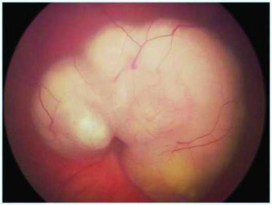 Офтальмоскопически в 2 глазах в стадии А (по международной АВС-классификации, 2001 г.) определяли проминирующий беспигментный узел серо-белого цвета с неровными, нечеткими границами, с гладкой поверхностью (табл. 2). Сосуды сетчатки дифференцированы (рис. 1). Рисунок 1. Рис. 1. Офтальмоскопия экзофитной РБ. Стадия А Эхографически проминенция опухоли составила: 2,3 мм - один глаз и