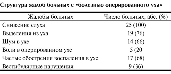 С января 2014 г. по апрель 2015 г. в Астраханском филиале НКЦО ФМБА России было прооперировано 25 больных с рецидивом ХГСО после ранее перенесенной СО по открытому типу. Возраст больных варьировал от 18 до 55 лет (64% мужчин, 36% женщин). Всем больным была выполнена санирующая реоперация с одномоментной мастоидопластикой стружкой ОКТ, взятой из области височной линии (ВЛ). Пациенты имели выраженную симптоматику, характерную для «болезни оперированного уха». Все больные жаловались на снижение слуха на оперированное ухо. Жалобы на отделяемое из оперированного уха предъявляли 76% больных (см. таблицу).
