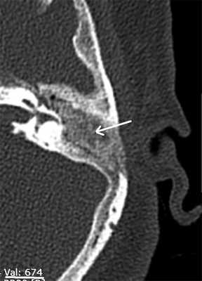 Рис. 3. МСКТ левой височной кости, аксиальная проекция. Стрелка — имплантированная костная стружка.
