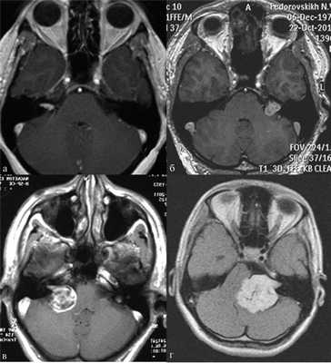 Общие сведения. Вестибулярные шванномы составляют 8% от всех внутричерепных образований, до 30% опухолей задней черепной ямки и 85% опухолей мосто-мозжечкового угла [2]. Термины «вестибулярная шваннома» и «невринома слухового нерва» являются синонимами, обозначающими доброкачественные опухоли, которые состоят полностью из шванновских клеток и исходят из вестибулярной порции слуховестибулярного нерва (более часто из верхней части вестибулярной порции) [3, 4]. В мировой литературе в основном используется термин «вестибулярная шваннома», а в отечественной — «невринома слухового (VIII) нерва».