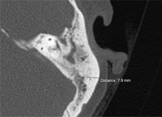 Результаты исследования 60 компьютерных томограмм височных костей больных с ХГСО показали, что наиболее оптимальным участком для взятия стружки аутокости для мастоидопластики является область ВЛ, так как именно в этом месте наружный кортикальный слой кости имеет наибольшую толщину и меньше риск повреждения важных анатомических структур. В среднем толщина наружного кортикального слоя в области височной линии составила 6,4 мм и варьировала от 3,2 мм до 8,3 мм (рис. 2). При толщине наружного кортикального слоя кости менее 4 мм удавалось получить пластический материал только для закрытия глубоких карманов МП. В 6 случаях полученной стружкой аутокости была выполнена полная облитерация М.П. Облитерация М.П. до уровня горизонтального полукружного канала была выполнена у 12 больных. При этом сформирована значительно меньшая по объему послеоперационная полость, что способствовало ее оптимальной эпидермизации. У двух больных вместе с МП был облитерирован эпитимпанум. В 5 случаях удалось взять пластический материал только для облитерации глубоких карманов МП в области верхушки сосцевидного отростка.