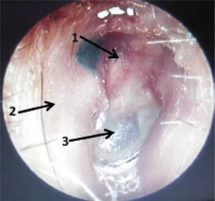 Рис. 1. Правое ухо. Отоэндоскопия отоскопом прямого видения 00 фирмы KARL STORZ. 1 — облитерированный эпитимпанум, 2 — задняя стенка наружного слухового прохода после полной мастоидопластики, 3 — неотимпанальный лоскут.