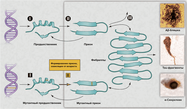 За производство прионной формы белка отвечает тот же ген, но имеющий одну или несколько из почти 40 мутаций, известных на сегодняшний день. Постепенно трансформируя подходящие белки, прионы образуют амилоиды — агрегаты белковой природы, сходные с амилоидными бляшками, формирующимися при болезни Альцгеймера. И это приводит к аналогичным последствиям — разрушению нервных клеток. Поэтому прионные инфекции относят к нейродегенеративным заболеваниям.