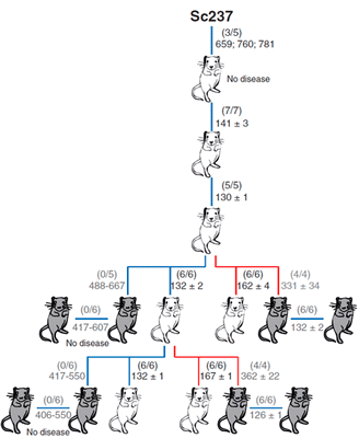 В качестве модельных объектов авторы использовали мышей: две линии, которые трансгенно экспрессировали овечий прионный белок, и одну линию, которая экспрессировала человеческий прионный белок (рис. 3). Задачей было сравнить эффективность межвидовой передачи инфекции посредством тканей мозга и селезёнки. Внутримозговое заражение чужеродным прионным белком выражалось в отсутствии или небольшом количестве инфекционного агента в мозгах этих мышей. Однако инфекционные чужеродные прионы обнаруживались в селезёнке на более ранних этапах заражения в сравнении с моментом, когда были использованы нейротропные прионы, тем самым определяя, что лимфатическая ткань может быть более пермиссивной к распространению чужеродных прионов по сравнению с мозгом.
