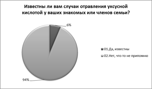 Вывод: Исходя из результатов диаграммы, большинство опрошенных не сталкивались со случиями отравления уксусной кислотой в быту.