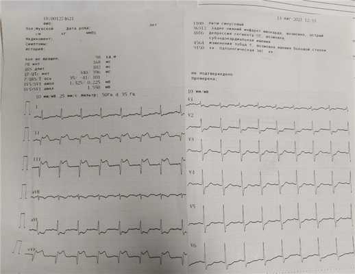 гипотония, обусловленная поражением правого желудочка, проводилась инфузионная и кардиотоническая терапия, на фоне которой гемодинамика стабилизирована. По стабилизации состояния был переведен в 1-е кардиологическое отделение.