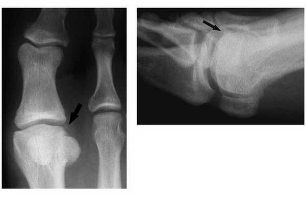 Локально отмечается выраженная болезненность как вдоль подошвенной, так и тыльной поверхности большого пальца и первого плюсне-фалангового сустава.