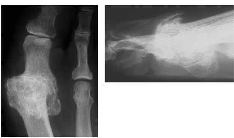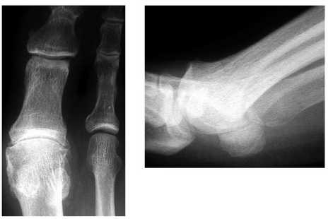 Наблюдается внезапная боль в плюснефаланговом (ПФ) суставе большого пальца стопы. Активные и пассивные движения сустава болезненны, сустав отечен.