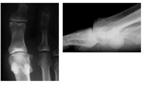 При тяжелых повреждениях связок первого пальца выполняется стандартная рентгенография для исключения возможных костных повреждений, будь то отрывы капсулы сустава с костными фрагментами, переломы сесамовидных костей, расхождение или миграция сесамовидных костей.