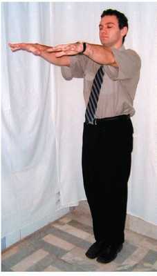 Исследование устойчивости в позе Ромберга. Обследуемый стоит, сблизив ступни, чтобы их носки и пятки соприкасались, руки вытянуты вперед на уровне груди, пальцы рук раздвинуты, глаза закрыты (рис. 1.18). В таком положении пациента следует подстраховать, чтобы он не упал. При нарушении функции лабиринта больной будет отклоняться в сторону, противоположную нистагму. Следует учесть, что и при патологии мозжечка может быть отклонение туловища в сторону поражения, поэтому исследование в позе Ромберга дополняется поворотами головы обследуемого вправо и влево. При поражении лабиринта эти повороты сопровождаются изменением направления падения, при мозжечковом поражении направление отклонения остается неизменным и не зависит от поворота головы.