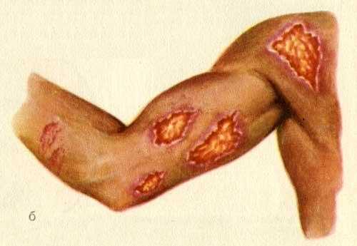 Для сельского (зоонозного) типа характерны относительно короткий инкубационный период (от 1-2 до 3-5 нед.) и не очень длительное (3-6 мес.) течение. Обычно на открытых участках кожи появляются конические бугорки с широким основанием, красно-синюшного цвета с буроватым или желтоватым оттенком, тестоватой консистенции. В дальнейшем бугорки увеличиваются в размерах и через 1-3 мес. вскрываются с образованием округлой или неправильной формы язвы с неровным дном и обильным серозно-гнойным экссудатом, ссыхающимся в слоистые плотные корки. Края язвы как бы изъедены. В окружности формируется тестоватый инфильтрат розовато-синюшного цвета, за которым прощупываются тяжи воспаленных лимфатических сосудов и так называемые четки вторичных лейшманиом. У детей отмечается более острое течение с фурункулоподобным, флюктуирующим пустулезным образованием очага, быстро абсцедирующим и некротизирующимся. Нередко у взрослых и детей процесс осложняется гнойной инфекцией с развитием флегмоны, рожистого воспаления. Воспалительный процесс заканчивается через - 3-8 мес. с образованием рубца и стойкого иммунитета к данному тину возбудителя.