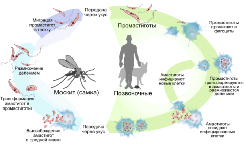В своем развитии лейшманиям необходимо пройти две стадии: безжгутиковую и жгутиковую в организме человека либо животного и переносчика соответственно. Амастиготы обитают внутри клеток, лишены способности к перемещению, промастиготы имеют жгутики для активных движений в пространстве. Находясь внутри самки москита, лейшмании активно размножаются в пищеварительном канале насекомого, после чего перемещаются к хоботку. Наиболее подвержены заражению дети до 5 лет, молодые мужчины, сельскохозяйственные работники, туристы, пациенты с ВИЧ-инфекцией, онкопатологиями.