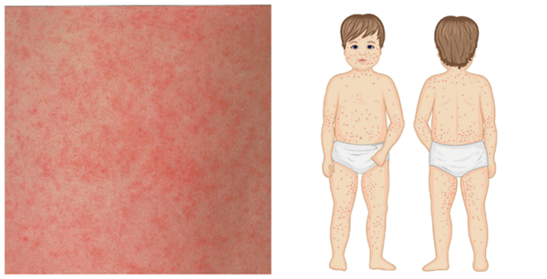 Источником заражения является больной человек, который выделяет вирус при чихании, кашле, как за несколько дней до проявления у него признаков болезни, так и в течение всего заболевания, а также нескольких дней после выздоровления. Первые признаки болезни: повышение температуры тела, легкое недомогание, катаральные явления в виде насморка, кашля, коньюктивита (покраснение глаз). Эти симптомы развиваются одновременно или за 1-2 дня до появления мелкопятнисто-папулезной сыпи ярко-красного цвета 5-7 мм в диаметре, которая вначале появляется на лице, спускается на туловище и через пару дней распространяется на конечности. Через 2-3 суток сыпь бесследно исчезает. Период высыпания сопровождается увеличением периферических лимфатических узлов.