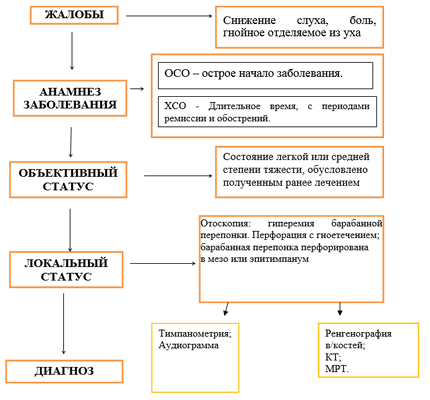 Жалобы и анамнез: на выраженную ушную боль, которая несколько уменьшилась после прободения перепонки, на наличие гнойного отделяемого из уха, снижение слуха, повышение температуры до 38 градусов и выше, головную боль, снижение аппетита, отказ от груди и резкий крик у грудных детей. Чаще симптомы проявляются на фоне или перенесенной вирусной инфекции или как осложнение детских инфекций.