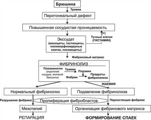 Примитивные стволовые клетки из субмезотелиального слоя, кровотока, брюшной полости или дедифференцированных макрофагов мигрируют на поверхность и дифференцируются в мезотелиоциты. Эти мезотелиальные клетки, позднее в ответ на цитокины и другие секретируемые макрофагами медиаторы, формируют маленькие островки, которые вырастают в слои мезотелиальных клеток на поврежденной области, что приводит к ремезотелизации брюшины. Организация фибриновой гелевой матрицы играет важнейшую роль в образовании спаек. Эта матрица образуется в несколько этапов, начиная с фибрина и фибрина-мономера, переходящего в растворимый полимер фибрина, и, наконец, вследствие промывания тканей во время операции растворами, становящегося нерастворимым полимером фибрина. Этот последний продукт взаимодействует с белками, включая фибронектин, и образует фибриновую гелевую матрицу. Гелевая матрица содержит лейкоциты, эритроциты, тромбоциты, эндотелий, мастоциты, а также осколки клеток. Две перитонеальные поверхности, расположенные напротив друг друга и покрытые фибриновой гелевой матрицей, образуют спайку не только сразу после хирургического повреждения, но и в течение следующих 3-5 дней [9].