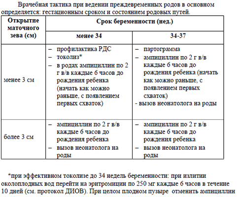 - ампициллин — начальная доза 2 г внутривенно сразу после диагностики преждевременных родов, затем по 1 г каждые 6 ч до родоразрешения;