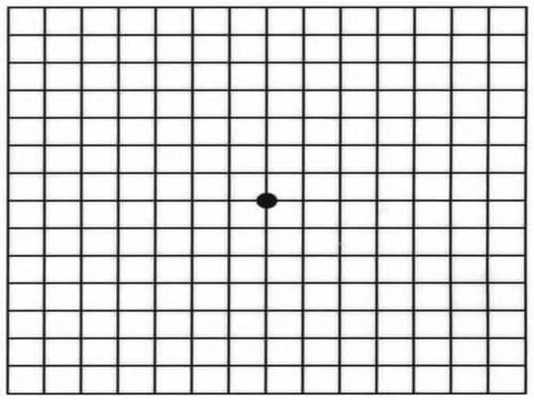 - тестируемым (открытым) глазом зафиксируйте взгляд на центральной точке, далее, не отрывая взгляд от центральной точки, постарайтесь оценить ровность линий, форму и размеры квадратов, видимость сетки;