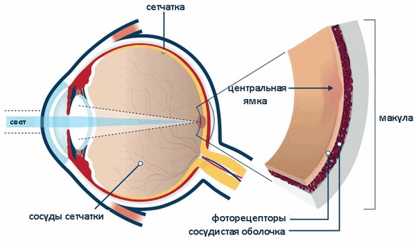 Дистрофия сетчатки глаза - это заболевание, при котором происходят дистрофические изменения в желтом пятне. Поражаются фоторецепторы-колбочки, воспринимающие свет, и человек постепенно теряет центральное зрение. Название заболевания происходит от двух слов: макула - пятно - и дегенерация (дистрофия) - нарушение питания.
