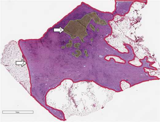 Рис. 7. Рак молочной железы после проведенного неоадъювантного лечения, окрашивание гематоксилином и эозином. Маркировка площади области опухоли. 1 — оставшиеся после неоадъювантного лечения живые опухолевые клетки; 2 — зона ложа опухоли, инфильтрированная лимфоцитами, ксантомными клетками, не включается в площадь области опухоли.