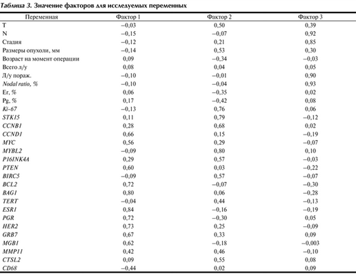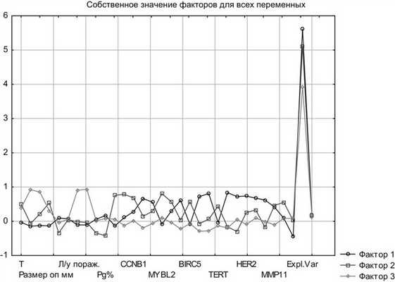 Используя клинические данные (размер опухоли, стадию заболевания) и 21-геннную сигнатуру произведен факторный анализ. Выделено 3 фактора, объясняющих 48% дисперсии общей выборки (табл. 2, рис. 1).