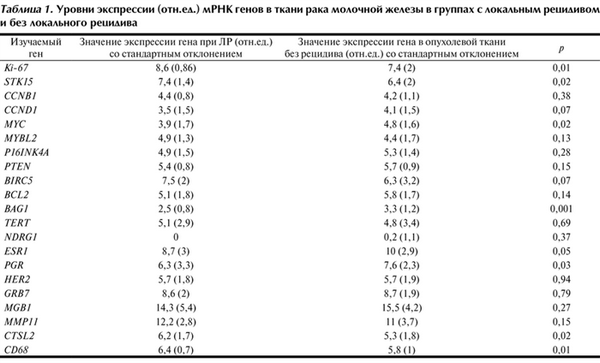 Таблица 1. Уровни экспрессии (отн.ед.) мРНК генов в ткани рака молочной железы в группах с локальным рецидивом и без локального рецидива