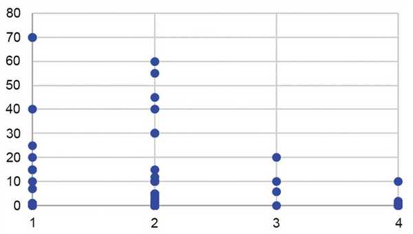 Рис. 10. Диаграмма, отражающая корреляцию между стадией Т и процентом окрашенных иммунных клеток относительно всей перитуморальной инфильтрации.