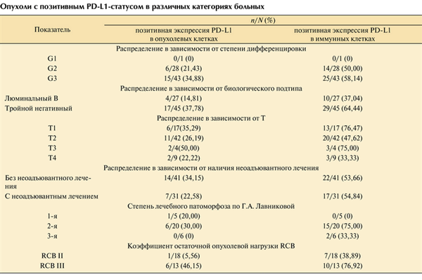 При оценке значения PD-L1-статуса опухоли для прогноза течения заболевания пациентов, прошедших неоадъювантное лечение, корреляции при использовании системы Г.А. Лавниковой не получено, и пациенты были разделены на две группы по классу остаточной опухолевой нагрузки RCB: RCB-II и RCB-III (больных со значительной резорбцией опухоли и средней клеточностью менее 10% в исследование не включали). Позитивный статус опухолевых клеток выявлен у 1 из 18 пациенток 1-й группы и 6 из 13 пациенток 2-й группы (5,56 и 46,15% соответственно). Окрашивание не менее 1% иммунных клеток наблюдали в 38,89% случаев RCB-II и в 76,92% RCB-III. Таким образом выявлена значимая корреляция между высокой остаточной опухолевой нагрузкой и позитивным PD-L1-статусом опухоли (p=0,02) (см. таблицу).