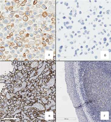 Рис. 1. Окрашивание тканевых контролей. а — положительная клеточная линия, ×400; б — отрицательная клеточная линия, ×400; в — плацента, ×100; г — миндалина, ×100.