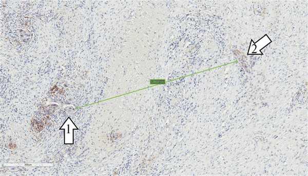 Рис. 6. Рак молочной железы, окрашивание PD-L1, ×50. 1 — опухолевые клетки; 2 — позитивно окрашенные лимфоциты, расположенные на расстоянии более 1 мм, при подсчете не учитываются. имеет те же критерии окрашивания, что и опухолевая клетка, однако здесь гранулярное окрашивание встречали чаще, чем линейное. Определяли соотношение окрашенных лимфоцитов относительно всех интратуморальных и перитуморальных лимфоцитов.