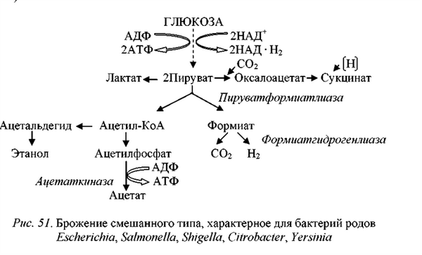 Рис.5 - Брожение смешанного типа, характерное для энтеробактерий родов Escherichia, Salmonella, Shigella, Citrobacter, Yersinia