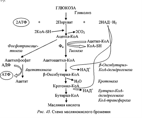 Маслянокислое брожение осуществляют такие анаэробы, как Cl. butyricum, Cl. tyrobu-tyricum, Cl. lactoacetophilum, и другие виды. Главные продукты брожения — масляная и уксусная кислоты. Так, сбраживание глюкозы Cl. butyricum можно описать уравнением
