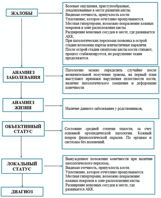 Жалобы и анамнез: ранее перенесенные патологические переломы, иногда многократные. Выявленные во время рентгенологического обследования кистозные образования в кости.