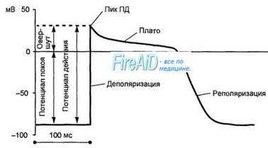 Потенциал действия клетки рабочего миокарда. Быстрое развитие деполяризации и продолжительнаяреполяризация. Замедленнаяреполяри-зация (плато) переходит в быструю реполяризацию. Потенциал действия клеток рабочего миокарда состоит из фазы быстрой деполяризации, начальной быстрой реполяризации, переходящей в фазу медленной реполяризации (фаза плато), и фазы быстрой конечной реполяризации (рис. 9.8). Фаза быстрой деполяризации создается резким повышением проницаемости мембраны для ионов натрия, что приводит к возникновению быстрого входящего натриевого тока. Последний, однако, при достижении мембранного потенциала 30—40 мВ инактивируется и в последующем, вплоть до инверсии потенциала (около +30 мВ) и в фазу «плато», ведущее значение имеют кальциевые ионные токи. Деполяризация мембраны вызывает активацию кальциевых каналов, в результате чего возникает дополнительный деполяризирующий входящий кальциевый ток