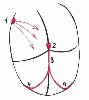 Рис. 2. Макропрепарат сердца с отпрепарированной левой ножкой пучка Гиса (полость левого желудочка вскрыта): левая ножка (1) пучка Гиса разделяется на переднюю (2), две промежуточные (3) и заднюю (4) ветви.